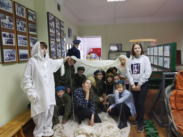 Наши мальчики на себе почувствовали, что такое настоящая армейская зарядка, узнали чем отличаются войска спецназа от десантных войск, научились подавать сигнал SOS с помощью азбуки морза,посидели в настоящем кресле космонавта. Не остались в стороне и девочки, хотя конечно по понятным причинам им было менее интересно. Но, растянутый во всю свою длину парашют никого не может оставить равнодушным.